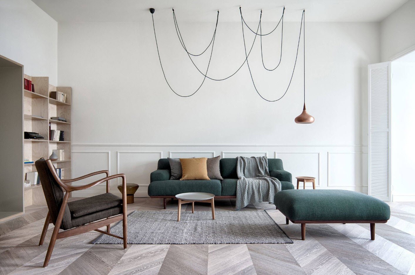 Стиль сдержанный и лаконичный, деревянный или наливной пол станет хорошим решением. Теплоты в интерьер добавят небольшие коврики.